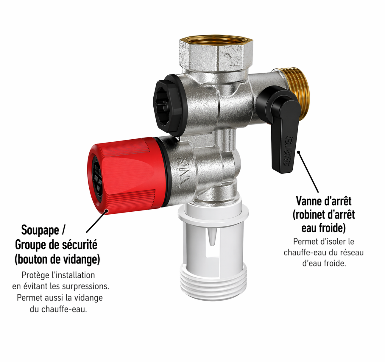Le groupe de sécurité est installé sur l’arrivée d’eau froide du ballon d’eau chaude. Il remplit plusieurs fonctions essentielles :