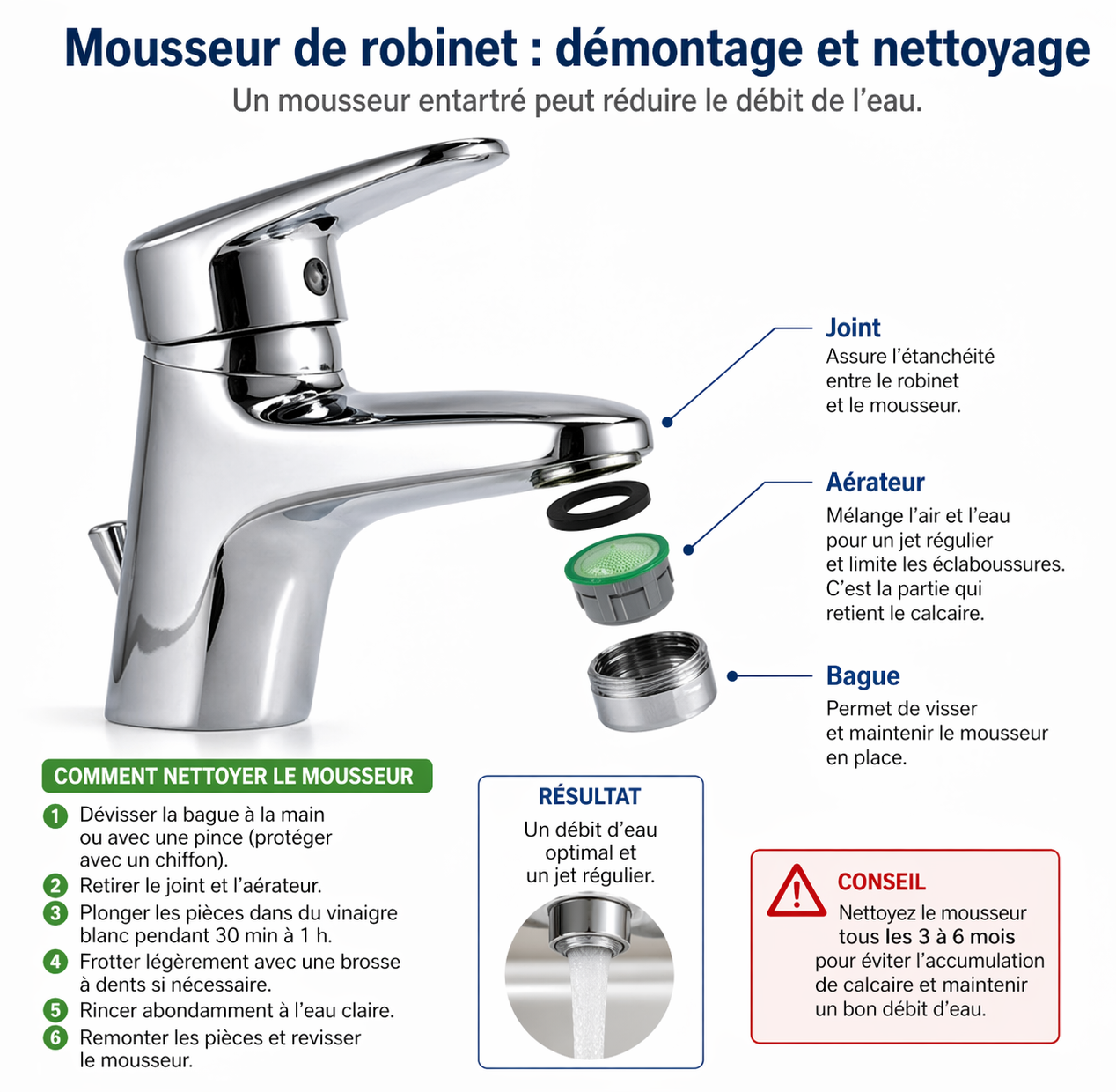Le mousseur est la petite pièce située à l’extrémité du robinet. Il permet de réguler le jet et d’éviter les éclaboussures.